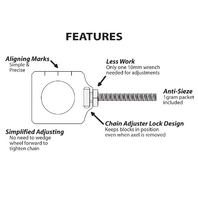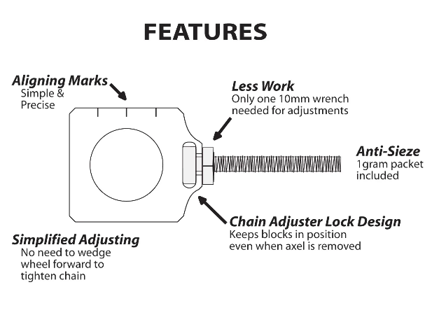 Hold the wheel precisely in place while tightening the chainUnique design means only one 10mm wrench is needed to make chain adjustments