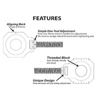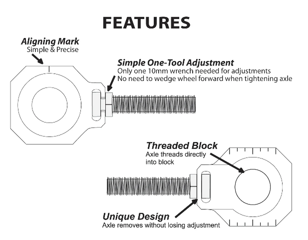 Unique design means only one 10mm wrench is needed to make chain adjustments