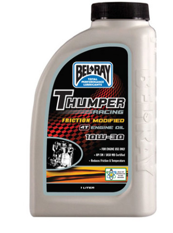 BEL-RAYØFriction Modified Thumper Racing 4T Engine Oil is a 4-stroke motorcycle racing oil formulated specifically for motorcycle applications using separate engines and transmissions.Ø Friction modifiers reduce engine temperature, increase horsepower and extend engine life. Meets API SM and JASO MB requirements Suitable for air-cooled/liquid-cooled 4-stroke engines NOT FORØUSE IN WET CLUTCH APPLICATIONS 1 LiterØ (12 per case)