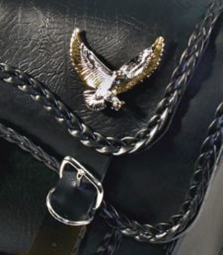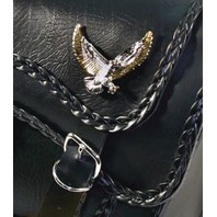 Features three strand braided design, large silver and gold eagle, along with quick release buckles, zip off yokes, removable carry handle and plastic reinforcement for shape retention