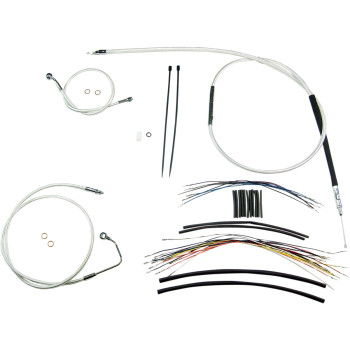Kit includes throttle and idle cables of throttle-by-wire extensions, clutch cable or hydraulic clutch line, brake lines, copper crush washers, hardware, and any necessary switch wiring of turn signal extension