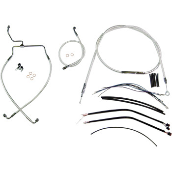 Kit includes throttle and idle cables of throttle-by-wire extensions, clutch cable or hydraulic clutch line, brake lines, copper crush washers, hardware, and any necessary switch wiring of turn signal extension