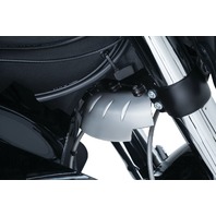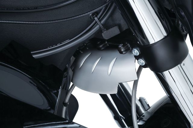 Lower Triple Tree Wind Deflectors redirect wind passing through the fork legs downward to reduce turbulent upward airflow between the tank and fairing. Made from durable stamped steel construction, available in chrome or satin black finish.