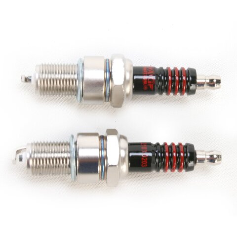 Plugs have a unique look with a black ceramic body and bold red logo/script