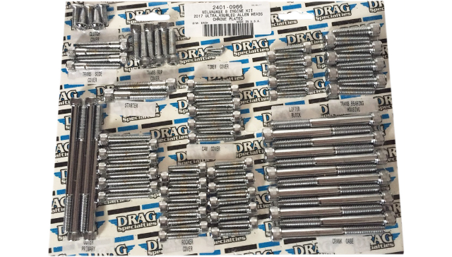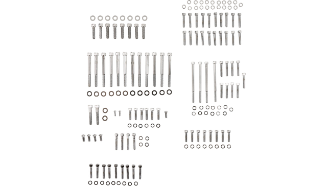 Includes bolts for clutch cover, transmission side and top covers, starter, timer cover, lifter block, transmission bearing housing, rocker cover, outer primary and crankcase