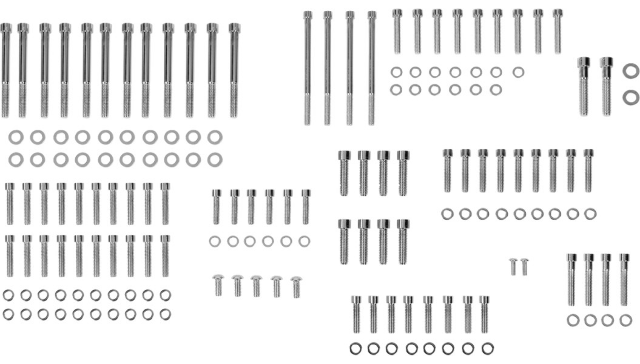 Includes bolts for clutch cover, transmission side and top covers, starter, timer cover, lifter block, transmission bearing housing, rocker cover, outer primary and crankcase