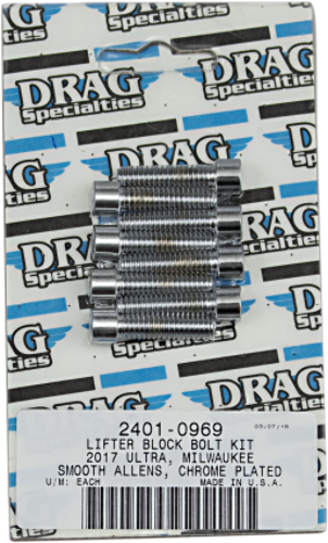 Revamp your engine's appearance and reliability with the Drag Specialties Chrome Lifter Block Bolt Kit featuring smooth Allen heads. This kit includes high-quality chrome-plated bolts designed to provide a clean, finished look while ensuring secure fastening of the lifter blocks. Ideal for riders seeking both aesthetic enhancement and dependable engine assembly components.