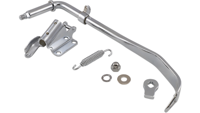 Kit includes a one-piece polished chrome mount with spring tab, kickstand, leg stop, spring and nut