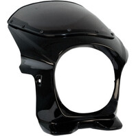 Gloss black headlight fairing with dark tinted windshield provides a racer feel