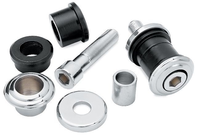 Kits include two lower flush mount cup washers, two heavy-duty wall top cup washers, four custom polyurethane bushings, two inner sleeves and fine or coarse allen hardware