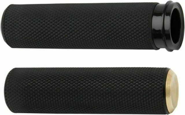 The perfect fusion of machined billet and high performance rubber. Each grip features good looks and excellent traction for your hands. Bevelled grips 1-1/4 in. billet collars and end caps feature deep machined pockets that are finished off with a beveled edge for a detailed yet clean look. Knurled grip rubber ensures excellent hand traction. Slot Track design features slotted 1-1/4 in. billet aluminum inner collars, diamond knurled grip rubber with Arlen Ness logo and slotted billet aluminum end caps. Port Hole, Deep Cut and Smoothie designs feature 1-1/4 in. billet aluminum inner collars, diamond knurled grip rubber and billet end cap with lazer Arlen Ness logo.