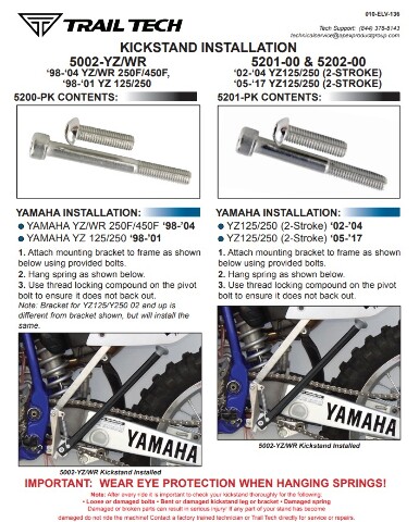 DISCLAIMER: Trail Tech Kickstands are intended for motorcycles with OEM equipment. Altering a bike with aftermarket wheels, suspension, or street tires can change a motorcycle's ride height and proper lean angle when parked. Please consider this when purchasing.