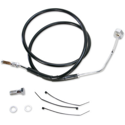 Features clear-coated stainless steel or black vinyl-coated braided extended lines with chrome steel fittings