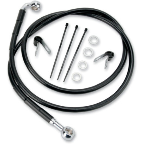 Features clear-coated stainless steel or black vinyl-coated braided extended lines with chrome steel fittings