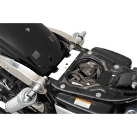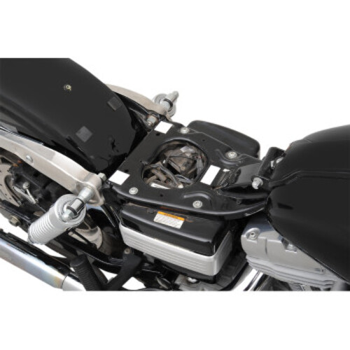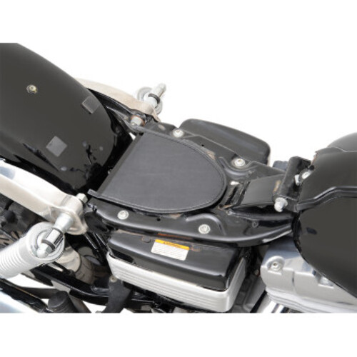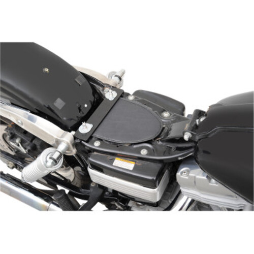 Designed for installing Drag Specialties large and small spring solo seats Includes spring mount bracket with 3" chrome springs, seat bracket, leather frame cover, and instructions Mount is black powder-coated, steel spring mount studs are stainless steel and all other hardware is zinc coated Height is determined based on spring style Made in the USA The large Drag Specialties Solo seat will not fit on XL models with 4.5 gallon fuel tank.