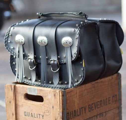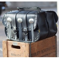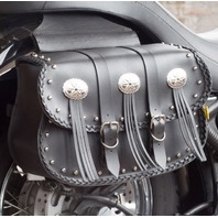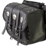 Features conchos, fringe, studded and braided design with quick release buckles zip off yokes, removable handles and plastic reinforcing for shape retention
