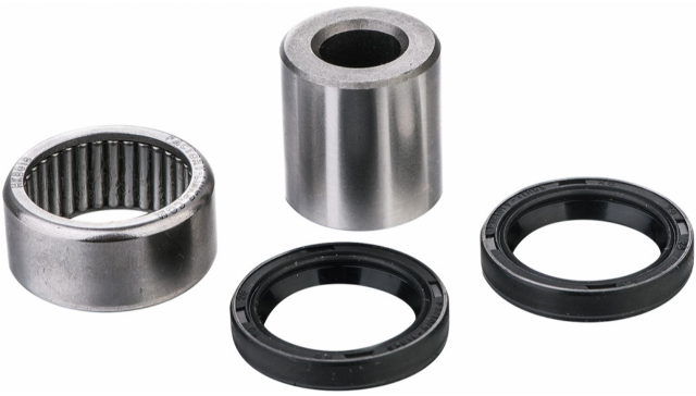 A: Each kit includes all components required to rebuild the lower shock mount, typically including needle bearings, pins, collars, and dust seals specific to your motorcycle model.