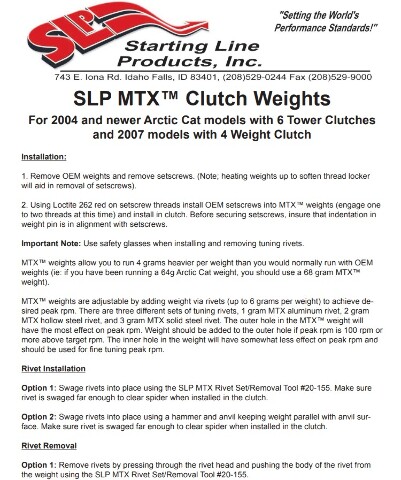 SLP's MTX™ Clutch Weights were designed specifically to harness the horsepower of today's high torque engines. Their unique heavy heel design and special weight profile provides substantially greater shift force which delivers much improved acceleration and top-end speed